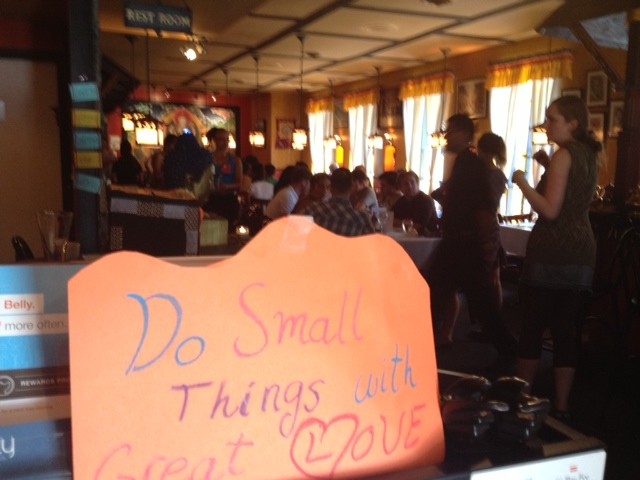 That Sunday at Karma Kitchen a couple from Baltimore had walked in. In the flow of their conversation with Aakruti they shared that it was their 8th wedding anniversary Aakruti wanted to make their day even more special and found that the deemed gift for 8th year is pottery. The tag box at the D.C. Karma kitchen is a treasure retrieve for such occasions. In it she found a candle holder with candle and beautiful decorations and also a stone with 'Love' inscribed on it. She tagged them with these two gifts and they were touched deeply by this act of generosity coming that too from a stranger. Their anniversary was now a Karma Kitchen community moment!